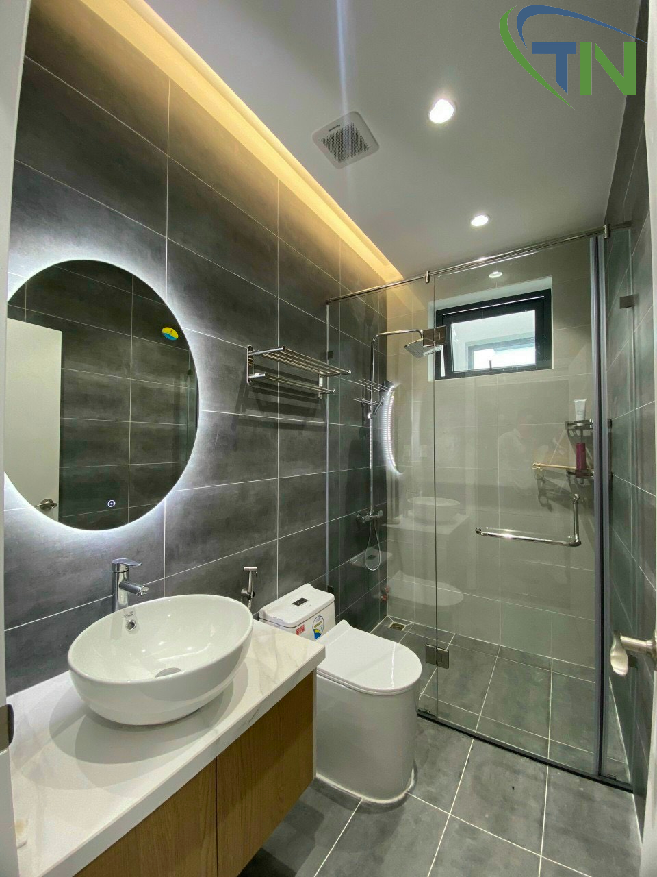 Phòng tắm nhỏ nhưng vẫn đầy đủ tiện nghi. Sử dụng vách kính ngăn giúp cách bố trí được gọn gàng hơn. Nhà vệ sinh với gam màu trung tính rất tối giản, dùng tủ chậu và kệ đựng đồ để sắp xếp thêm khoa học,phòng tắm đơn giản, ít màu sắc nhưng vẫn đem đến nét đẹp hiện đại, sang trọng