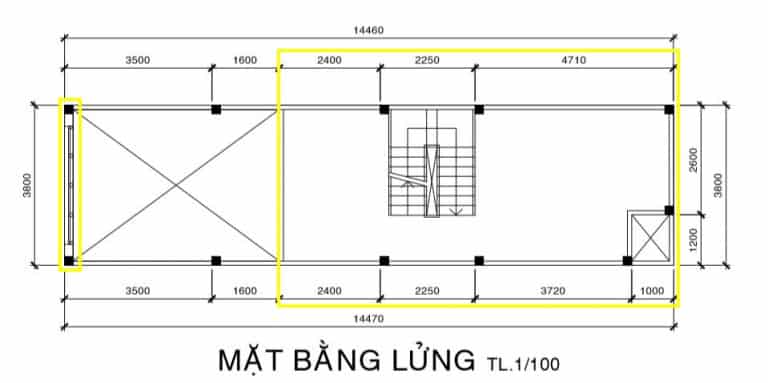 Tầng lửng thì chia thành diện tích sàn & diện tích thông tầng có cách tính khác nhau. Chiều dài tầng lửng là: 2.4 + 2.25 + 3.72 + 1.0 = 9.37 + 0.2 = 9.57 ( 0.2 là độ dày của tường vì diện tích sàn bao gồm phạm vi mép ngoài của tường). Chiều dài thông tầng là: 3.5 + 1.6 – 0.2 = 4.9m.