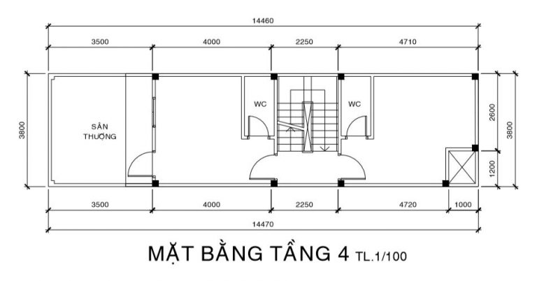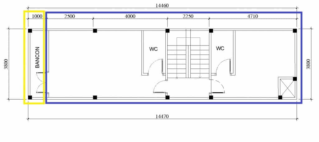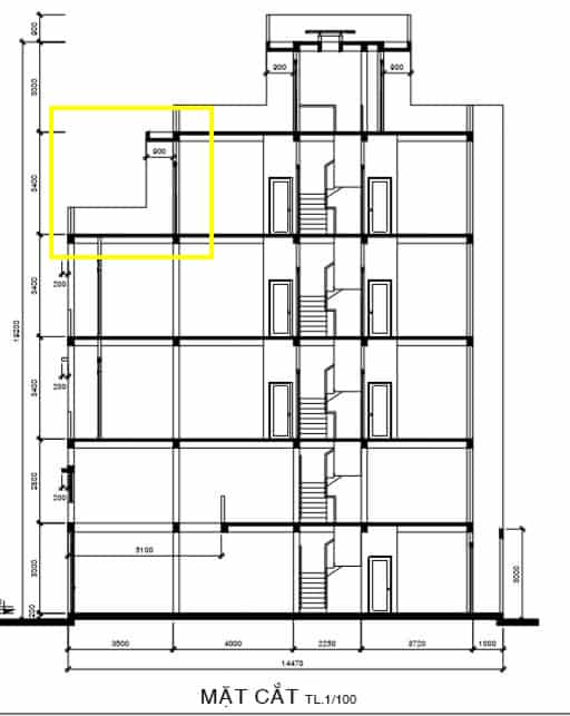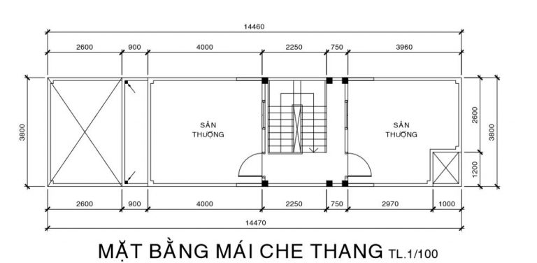 Mặt bằng mái che thang hay còn là sân thượng, chuồng cu, tum: Chiều dài sàn: 2.25 + 0.75 + 0.9 = 4.8. Hệ số tính 100% diện tích đây được xem là phần nhà. Chiều dài sân thượng trước: 4m. Chiều dài sân sau: 2.97 + 0.1 = 3.07m (tổng chiều dài của cả 3 phần sẽ là: 4.8 + 4.0 + 3.07 = 14.47m).