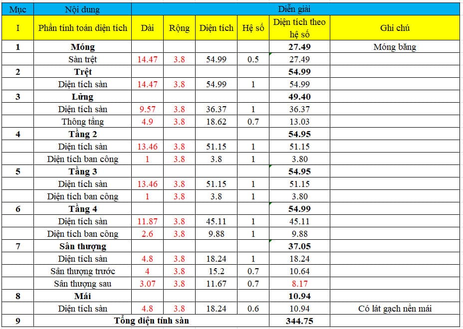 - Chiều rộng 3.8m Hệ số với mái bê tông cốt thép, không lát gạch là: 0.5.
