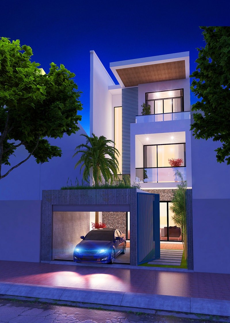 Thiết kế nhà phố 3 tầng mặt tiền 5m có gara để xe rộng rãi phía trước.