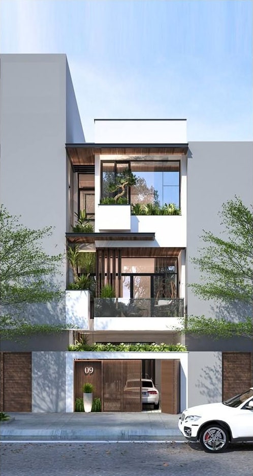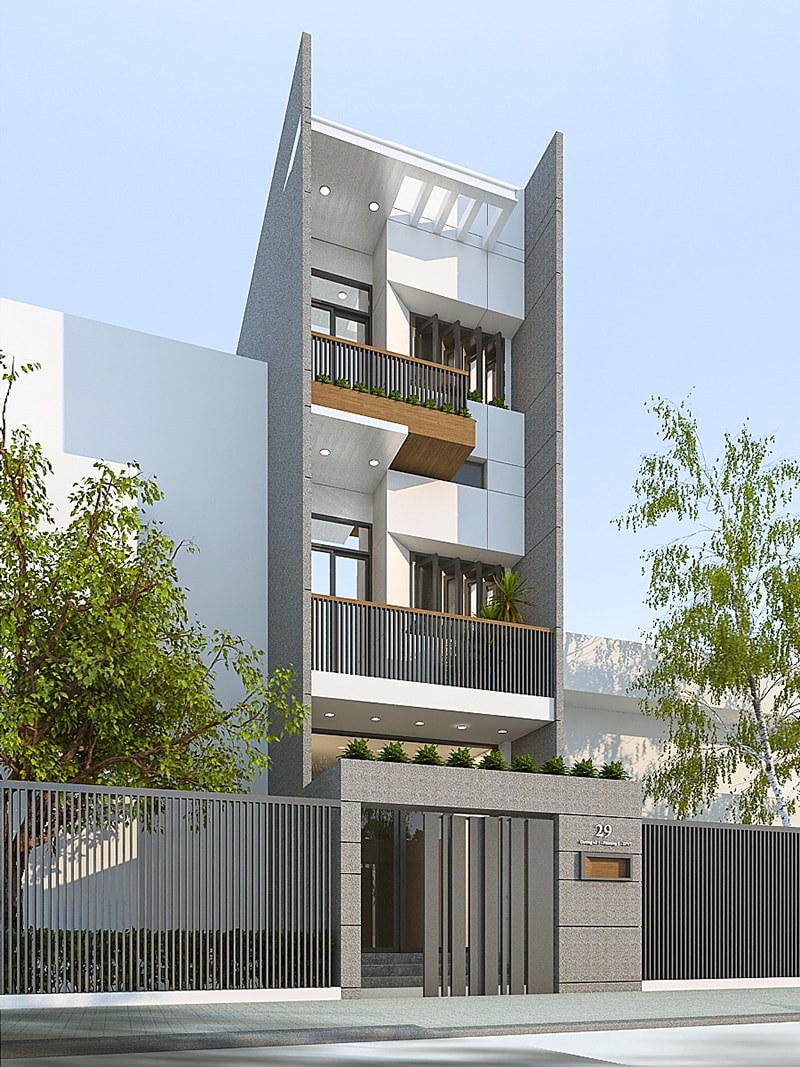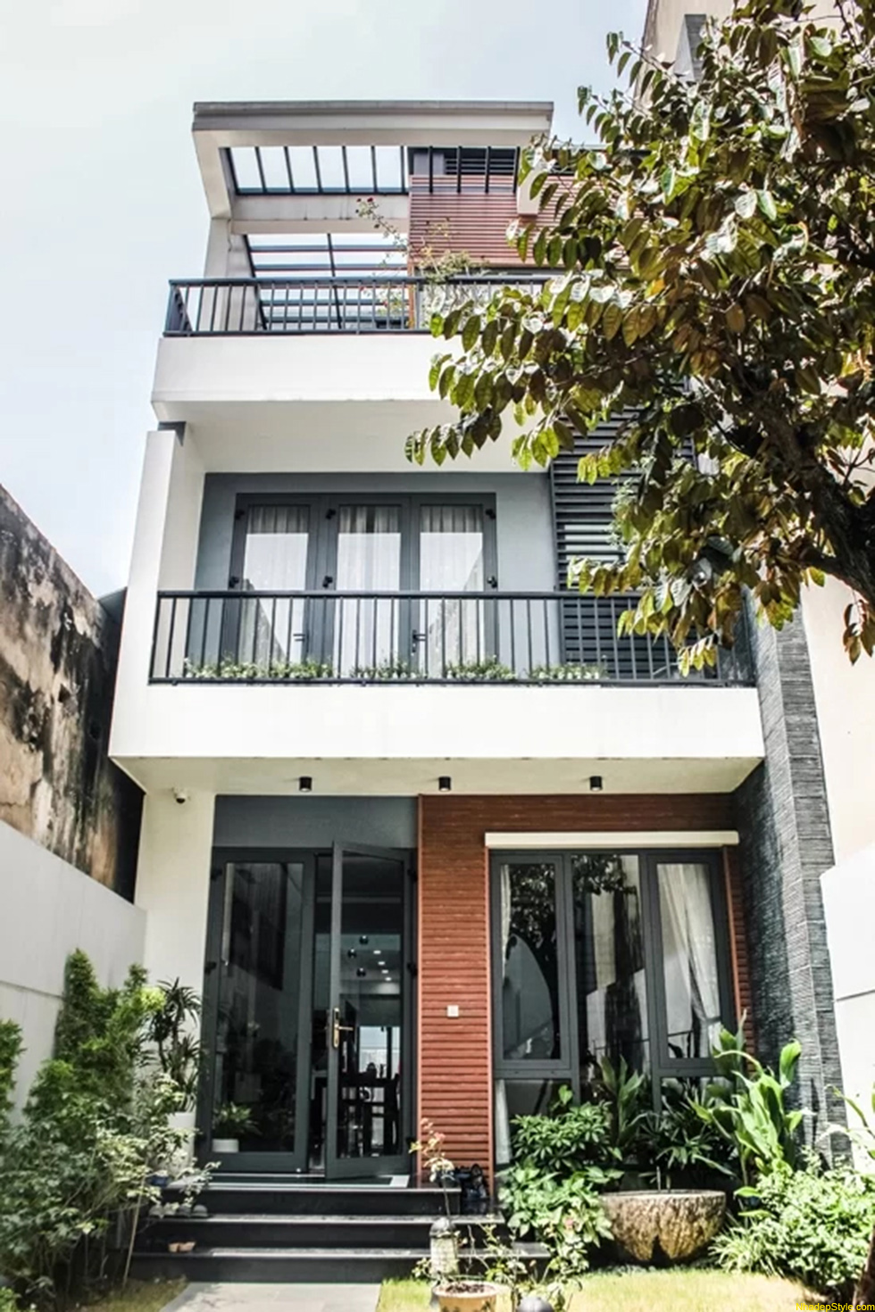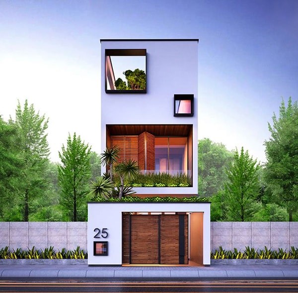 Mẫu nhà dưới đây lại có những đường nét thiết kế đơn giản, các mảng tường vuông vức với sự hạn chế về ánh sáng bên cạnh mẫu nhà phố mặt tiền 5m. Trên tầng lầu có ban công rộng để trồng cây xanh trong khi đó các hệ cửa kết hợp với khung gỗ, khiến ngôi nhà trở nên ấm áp, gần gũi thiên nhiên hơn.