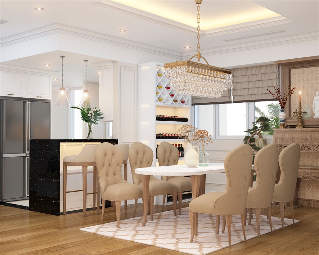 Phòng ăn: Bao gồm có kệ tủ bếp, đảo bếp, các dụng cụ làm bếp và bàn ăn, một phòng bếp vừa đủ rộng – nơi để mọi người cũng ăn với nhau bữa cơm, đây là nơi cả gia đình xum họp sau thời gian làm việc mệt nhọc.